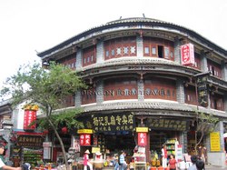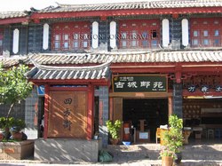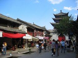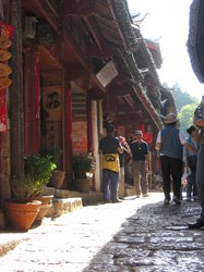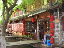 盛名之下。作為全國唯一沒有建城牆的古代城市,本來四通八達的大研鎮在成為遊客熱點之後便得進行各式各樣的整形手術:以混凝土建造了一幅與周邊環境毫不相干的灰色硬牆,上面還硬繃繃的刻有線條和造型都教人莫名奇妙的浮雕為古城區分一個正統入口,旁邊還有釉上了鮮紅色的領導人題字,與永恆地人聲鼎沸的入口處構成一幅俗不可耐的「富起來」示範圖;古城內十居其十的民居都已改為食肆商店,偶然看見一、兩個納西族老人家拖著小孫兒緩緩走過已被餐桌攻佔的石板小街,與這些喧鬧嘈雜聲沒有丁點兒關連,可笑是他們才是大研鎮的居民,